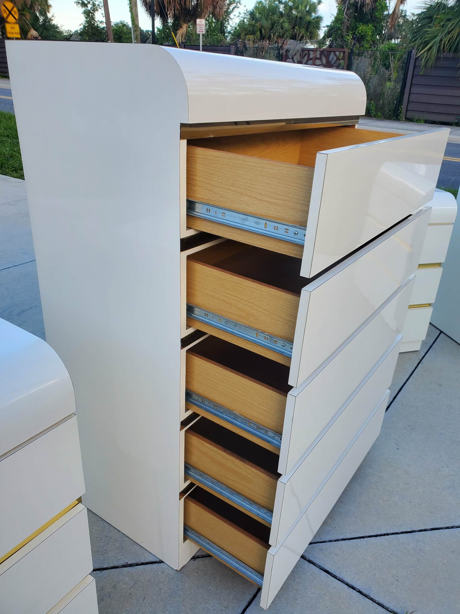Available is a Post-Modern Waterfall Laminate Chest with gold accents. This chest is still in really good shape and all drawers slide as should. There are a couple of minor imperfections as noted in the pictures. Still very sturdy with a clean laminate finish. We have several pieces of this set available. Contact us for an accurate shipping quote or questions about the other pieces. We can discount bulk shipping.